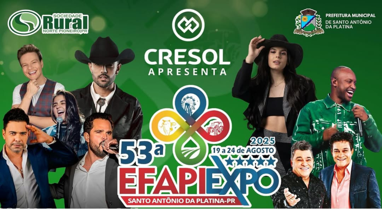 A maior EFAPI de todos os tempos celebra os 111 anos de Santo Antônio da Platina A tradicional 53ª EFAPI EXPO acontece de 19 a 24/08 em Santo Antônio da Platina (PR), celebrando os 111 anos da cidade joia com uma programação imperdível. Serão seis dias de festa com atrações para todos os gostos, incluindo … Ler mais