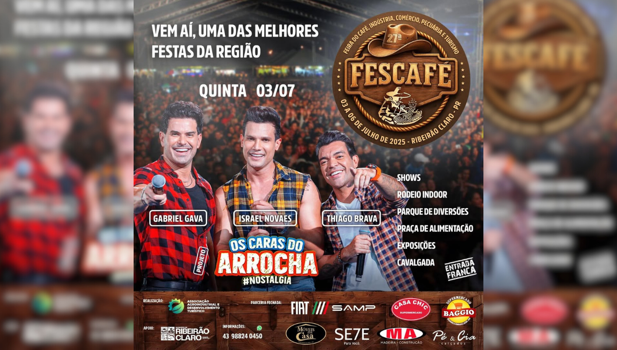 A maior festa da região está chegando! Prepare-se para 4 dias inesquecíveis na 27ª FESCAFÉ – Feira do Café, Indústria, Comércio, Pecuária e Turismo de Ribeirão Claro/PR! Informações: https://www.instagram.com/fescafe_ribeiraoclaro/ Data: 03/07 a 06/07 Local: Parque de Exposições, Ribeirão Claro